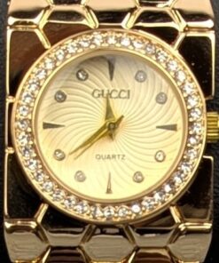 Elegant Golden Ladies Quartz Watch with Crystal Bezel – Premium Bracelet Design (Golden Dial)