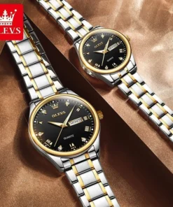 Olevs 5563 Two-Tone Chain Couple Watch with Black DialCelebrate timeless elegance and shared moments with the Olevs 5563 Two-Tone Chain Couple Watch featuring a striking black dial. Designed for couples who appreciate refined style and reliable performance, this matching set combines classic aesthetics with modern functionality.Key FeaturesElegant Two-Tone DesignThe watch features a sophisticated dual-tone stainless steel bracelet, blending silver and gold hues to create a versatile accessory that complements various outfits and occasions.Classic Black DialBoth men’s and women’s models showcase a clean black dial with luminous hour markers and hands, ensuring easy readability in low-light conditions.Reliable Quartz MovementPowered by a precise quartz movement, this watch offers accurate timekeeping with minimal maintenance, making it ideal for daily wear.Water ResistanceWith a water resistance depth of 30 meters (3 ATM), the watch is suitable for everyday use, including handwashing and light rain exposure.Comfortable FitThe adjustable stainless steel bracelet ensures a secure and comfortable fit on the wrist, accommodating various sizes.SpecificationsFeatureMen’s WatchWomen’s WatchCase Diameter40mm29mmCase Thickness9.5mm9.5mmBand Width18mm14mmBand Length20cm19cmMovementQuartzQuartzWater Resistance30 meters (3 ATM)30 meters (3 ATM)Clasp TypeFolding Clasp with SafetyFolding Clasp with SafetyWarranty1 Year1 Year Why Choose the Olevs 5563 Couple Watch?Timeless Aesthetic: The elegant two-tone design and classic black dial make this watch a versatile accessory suitable for various occasions.Reliable Performance: The precise quartz movement ensures accurate timekeeping, keeping you punctual and stylish.Durable Build: The stainless steel construction offers durability, ensuring the watch remains a staple in your collection for years to come.Perfect Gift: This matching couple watch set makes for a thoughtful and meaningful gift, symbolizing shared moments and lasting memories.Embrace elegance and shared style with the Olevs 5563 Two-Tone Chain Couple Watch with Black Dial. Whether you’re celebrating a special occasion or simply enjoying everyday moments together, this watch set is a timeless companion that complements your lifestyle.