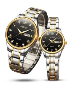 Olevs 5563 Two-Tone Chain Couple Watch with Black DialCelebrate timeless elegance and shared moments with the Olevs 5563 Two-Tone Chain Couple Watch featuring a striking black dial. Designed for couples who appreciate refined style and reliable performance, this matching set combines classic aesthetics with modern functionality.Key FeaturesElegant Two-Tone DesignThe watch features a sophisticated dual-tone stainless steel bracelet, blending silver and gold hues to create a versatile accessory that complements various outfits and occasions.Classic Black DialBoth men’s and women’s models showcase a clean black dial with luminous hour markers and hands, ensuring easy readability in low-light conditions.Reliable Quartz MovementPowered by a precise quartz movement, this watch offers accurate timekeeping with minimal maintenance, making it ideal for daily wear.Water ResistanceWith a water resistance depth of 30 meters (3 ATM), the watch is suitable for everyday use, including handwashing and light rain exposure.Comfortable FitThe adjustable stainless steel bracelet ensures a secure and comfortable fit on the wrist, accommodating various sizes.SpecificationsFeatureMen’s WatchWomen’s WatchCase Diameter40mm29mmCase Thickness9.5mm9.5mmBand Width18mm14mmBand Length20cm19cmMovementQuartzQuartzWater Resistance30 meters (3 ATM)30 meters (3 ATM)Clasp TypeFolding Clasp with SafetyFolding Clasp with SafetyWarranty1 Year1 Year Why Choose the Olevs 5563 Couple Watch?Timeless Aesthetic: The elegant two-tone design and classic black dial make this watch a versatile accessory suitable for various occasions.Reliable Performance: The precise quartz movement ensures accurate timekeeping, keeping you punctual and stylish.Durable Build: The stainless steel construction offers durability, ensuring the watch remains a staple in your collection for years to come.Perfect Gift: This matching couple watch set makes for a thoughtful and meaningful gift, symbolizing shared moments and lasting memories.Embrace elegance and shared style with the Olevs 5563 Two-Tone Chain Couple Watch with Black Dial. Whether you’re celebrating a special occasion or simply enjoying everyday moments together, this watch set is a timeless companion that complements your lifestyle.