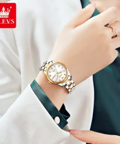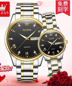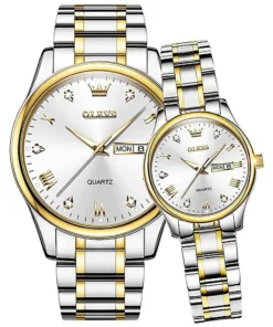 Olevs 5563 Two-Tone Chain Couple Watch with White DialCelebrate timeless elegance and shared moments with the Olevs 5563 Two-Tone Chain Couple Watch. Designed for couples who appreciate refined style and reliable performance, this matching set combines classic aesthetics with modern functionality.Key FeaturesElegant Two-Tone DesignThe watch features a sophisticated dual-tone stainless steel bracelet, blending silver and gold hues to create a versatile accessory that complements various outfits and occasions.Classic White DialBoth men’s and women’s models showcase a clean white dial with luminous hour markers and hands, ensuring easy readability in low-light conditions.Reliable Quartz MovementPowered by a precise quartz movement, this watch offers accurate timekeeping with minimal maintenance, making it ideal for daily wear.Water ResistanceWith a water resistance depth of 30 meters (3 ATM), the watch is suitable for everyday use, including handwashing and light rain exposure.Watch Zone+2Watch Zone+2Comfortable FitThe adjustable stainless steel bracelet ensures a secure and comfortable fit on the wrist, accommodating various sizes.SpecificationsFeatureMen’s WatchWomen’s WatchCase Diameter40mm29mmCase Thickness9.5mm9.5mmBand Width18mm14mmBand Length20cm19cmMovementQuartzQuartzWater Resistance30 meters (3 ATM)30 meters (3 ATM)Clasp TypeFolding Clasp with SafetyFolding Clasp with SafetyWarranty1 Year1 Year Why Choose the Olevs 5563 Couple Watch?Timeless Aesthetic: The elegant two-tone design and classic white dial make this watch a versatile accessory suitable for various occasions.Reliable Performance: The precise quartz movement ensures accurate timekeeping, keeping you punctual and stylish.Durable Build: The stainless steel construction offers durability, ensuring the watch remains a staple in your collection for years to come.Perfect Gift: This matching couple watch set makes for a thoughtful and meaningful gift, symbolizing shared moments and lasting memories.Embrace elegance and shared style with the Olevs 5563 Two-Tone Chain Couple Watch. Whether you’re celebrating a special occasion or simply enjoying everyday moments together, this watch set is a timeless companion that complements your lifestyle.