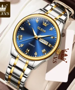 Olevs 5563 Luxury Fashion Round Women’s Watch – Silver & BlueChic Elegance Meets Everyday PrecisionMake a bold statement with the Olevs 5563, a luxury-inspired quartz watch featuring a stylish silver-and-blue two-tone design. Perfectly tailored for the modern woman, this timepiece delivers both functional sophistication and eye-catching elegance.Key FeaturesHigh-Precision Quartz MovementEnsures consistent timekeeping with minimal maintenance, combining accuracy and reliability.Elegant Round Dial (32 mm)Features a refined silver and blue color scheme with luminous hands and hour markers, offering clear readability in any light.Complete Calendar FunctionalityEquipped with easy-to-use day and date indicators, making it convenient for everyday scheduling.Durable Stainless-Steel Case & BandBuilt to last with polished stainless steel construction and a secure push-button hidden clasp for seamless wear.Scratch-Resistant Glass (Hardlex Coating)Protects the dial from everyday wear and maintains a clear, pristine appearance.Slim & Feminine DesignA sleek 11 mm case thickness and balanced proportions ensure both comfort and style.Water-Resistant (3 ATM / 30 m)Suitable for daily wear, including light rain and splashes (not ideal for swimming or bathing).1-Year Manufacturer WarrantyOffers peace of mind, knowing your purchase is backed by reliable support.SpecificationsFeatureDetailsMovementQuartzCase Diameter32 mmCase Thickness11 mmCase MaterialStainless SteelDial ColorsSilver & BlueBand MaterialStainless SteelClasp TypePush-Button Hidden ClaspGlass TypeHardened Mineral (Hardlex)Calendar DisplayDay & DateLuminous HandsYesWater Resistance3 ATM / 30 metersWarranty1-Year Official Warranty Why Choose the Olevs 5563?Stylish Two-Tone Design – The silver-gold and blue color palette radiates refined elegance, making this watch a versatile accessory for both casual and dressy ensembles.Reliable Everyday Wear – Built for longevity with sturdy materials and protective glass, while remaining comfortable with a slim profile.Practical Features in a Compact Design – The calendar and luminous hands are user-friendly enhancements without compromising the watch’s grace.Gift-Ready Luxury at an Accessible Price – Delivering a luxe look and feel, it makes a thoughtful and stylish gift for any occasion.Ideal For:Fashion-conscious individuals, gift-givers seeking elegance and value, or anyone looking for a reliable yet eye-catching wristwatch that embraces modern grace.